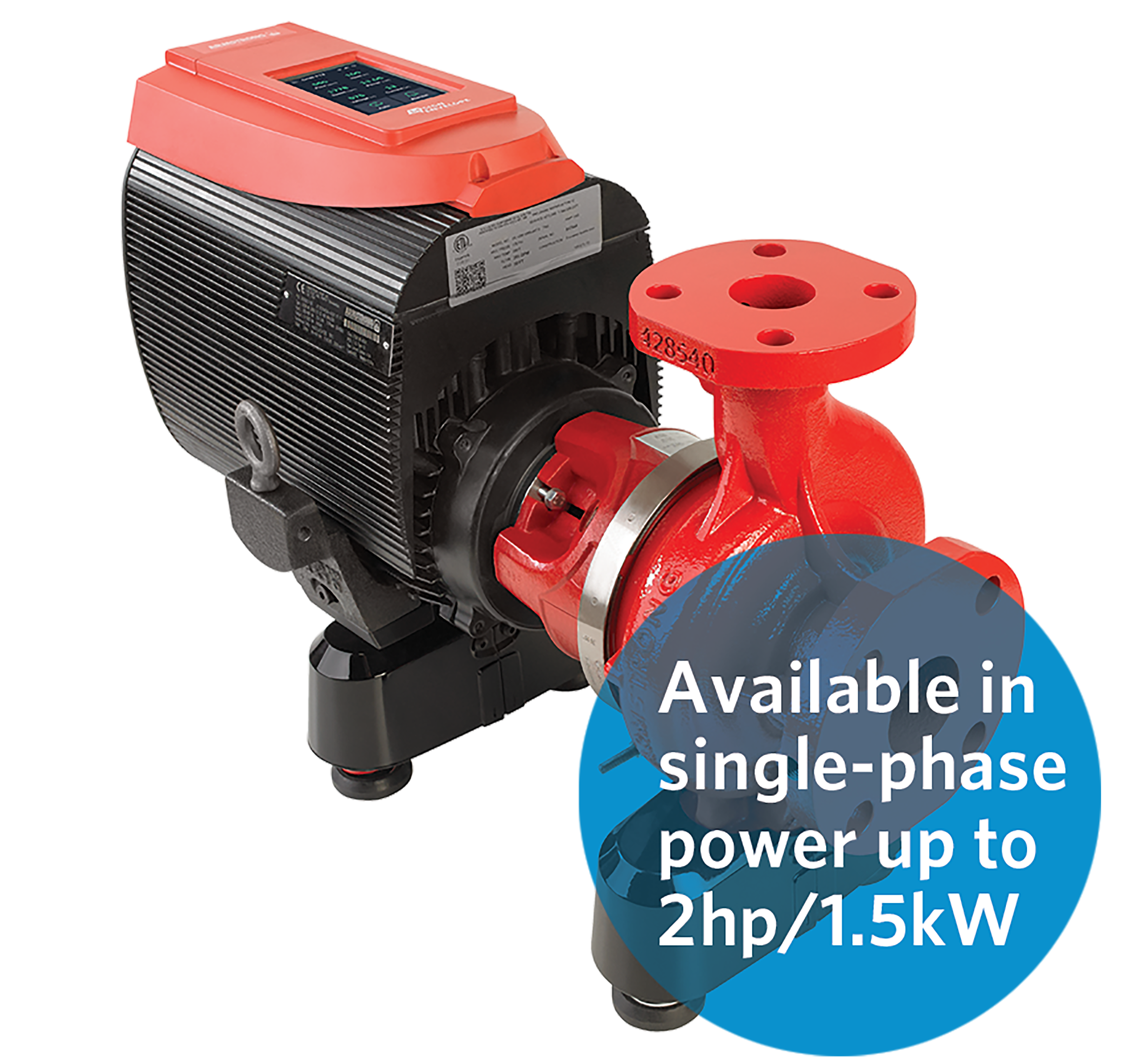 Base mounted end-suction horizontal pumping unit with integrated intelligent controls for easier installation and superior energy performance. Saves up to 75% in energy over comparable traditional constant speed or variable frequency operated pump installations. Units up to 10hp (7.5kW) include integral vibration isolators.