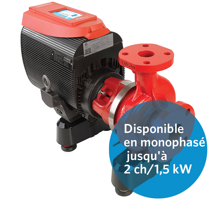 Unité de pompage horizontale à aspiration axiale et montée sur socle avec contrôles intelligents intégrés pour une installation simplifiée et des performances énergétiques supérieures. Permet d’économiser jusqu’à 75 % d’énergie par rapport à des installations de pompage classiques comparables fonctionnant à vitesse constante ou à fréquence variable. Unités allant jusqu’à 10 CV (7,5 kW), comprenant des systèmes complets d’isolation contre les vibrations.
